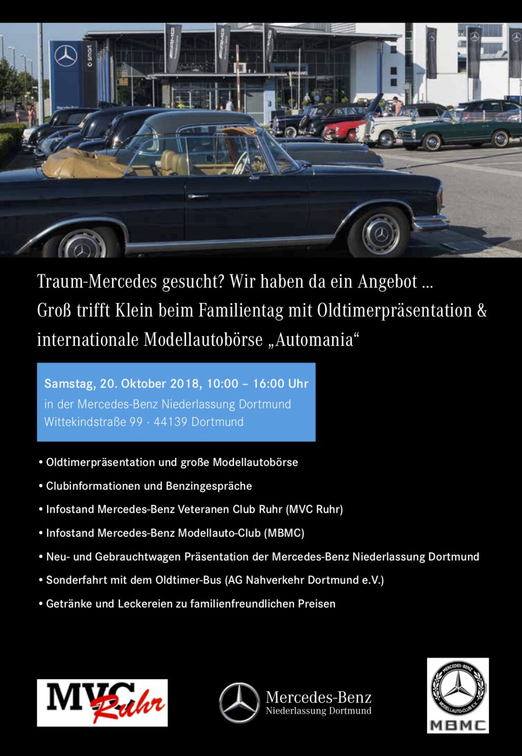 Anlässlich seiner Jahresversammlung in Dortmund veranstaltet der Mercedes-Benz Modellauto-Club e.V. (MBMC) gemeinsam mit dem Mercedes-Benz Veteranen Club Ruhr (MVC Ruhr) eine große Modellautobörse und Oldtimerausstellung in der Mercedes-Benz Niederlassung Dortmund, Wittekindstraße 99.