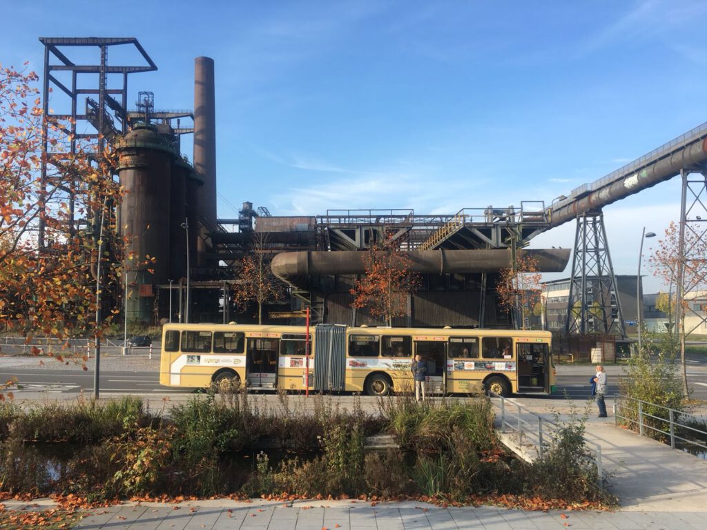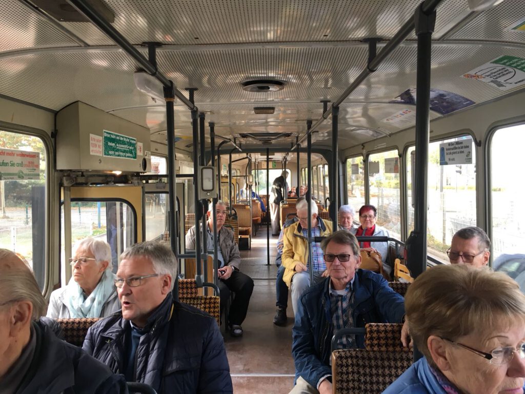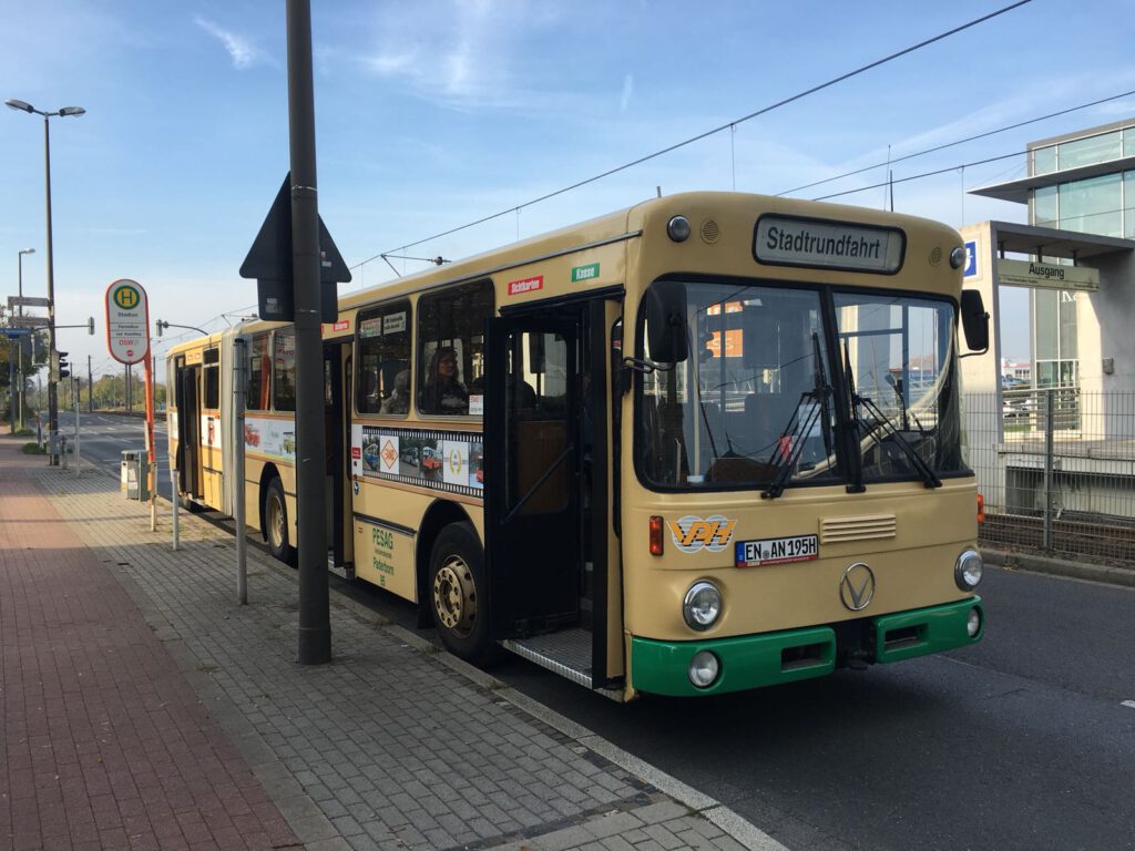 Gegen 9:30 Uhr erreichte der historische Mercedes-Benz Vetter-Gelenkbus (AG Nahverkehr Dortmund e.V.) seine Haltestelle, um von dort eine Stunde später zur mehrstündigen Ruhrgebietsrundfahrt bis zur Halde Hoheward in Herten abzufahren. Leider war nur die Hälfte der 60 verfügbaren Sitzplätze belegt, bei schönstem Kaiserwetter haben viele eine schöne Tour verpasst. Und 20 Euro Fahrgeld dürfte wohl nicht wirklich ins Gewicht fallen, eine Tageskarte im VRR ist teurer und bietet weniger genußvolles Sightseeing.