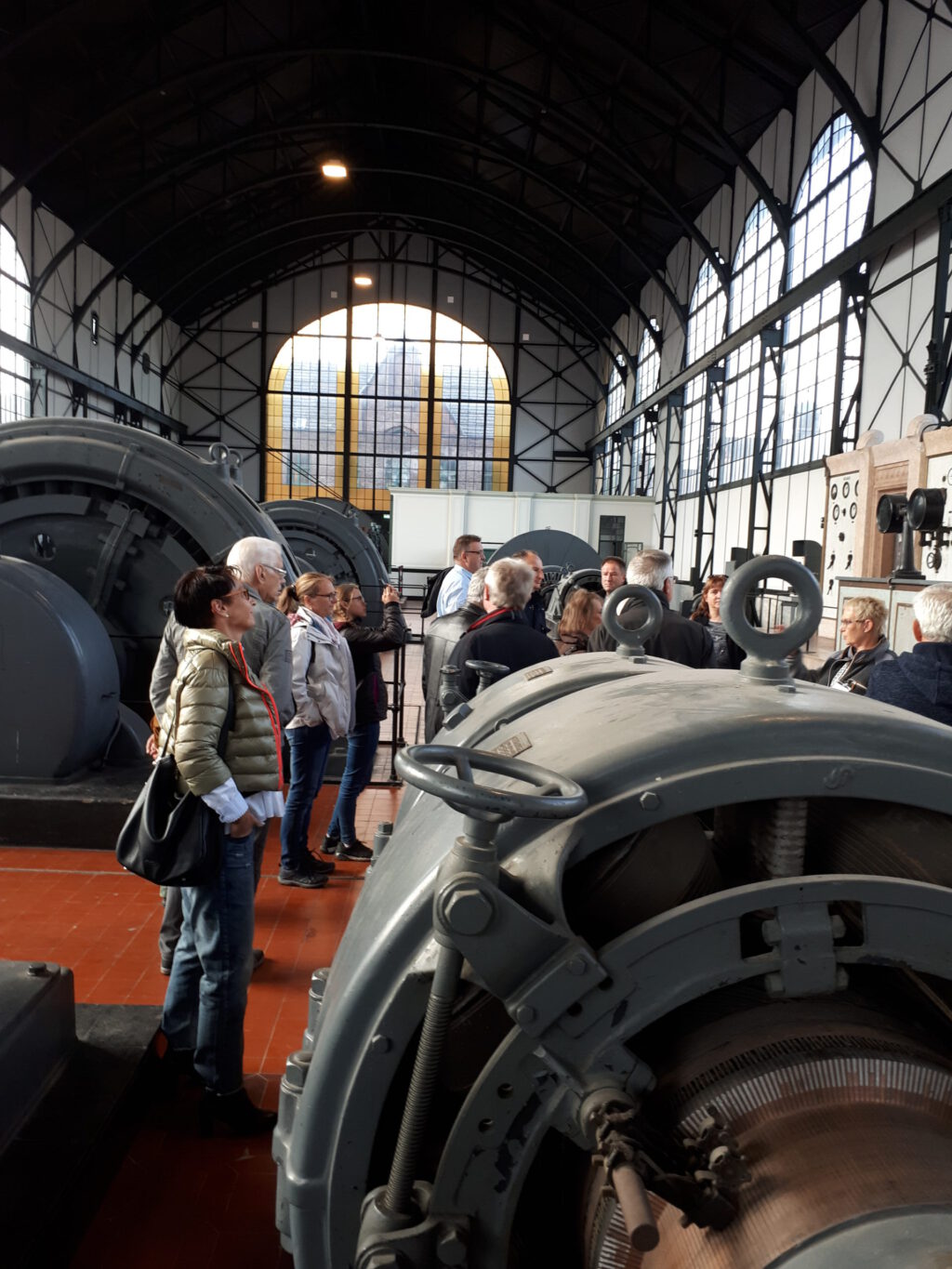 Beim Rundgang gelangten wir auch zur zentralen Maschinenhalle, die seinerzeit nicht mehr in massiver Bauweise ausgeführt, sondern in der Hoffnung auf schnellere Fertigstellung als eine mit Backstein ausgefachte Eisenfachwerk-Konstruktion erbaut wurde. In der freitragenden Halle waren wir von den gewaltigen elektrischen Fördermaschinen und der marmorunterlegten Elektro-Schaltzentrale mit insgesamt neun Leitstellen und unzähligen Originalmeßinstrumenten sehr beeindruckt, aber auch von der aufwändig gestalteten (Bunt-) Glasfensterarchitektur an den Jugendstil-Portalen.