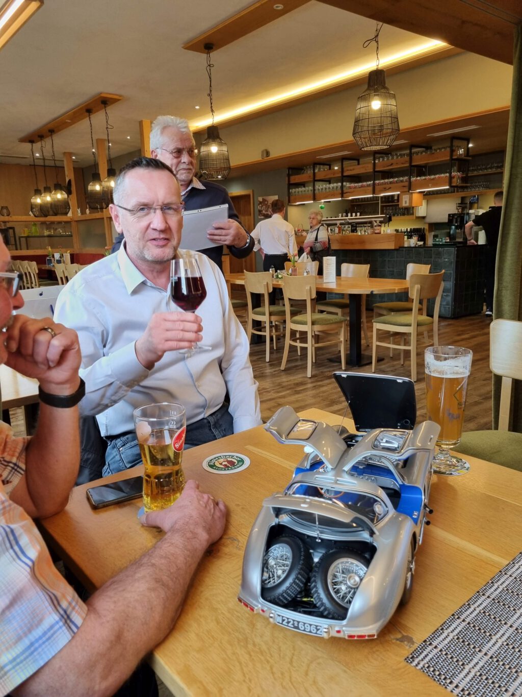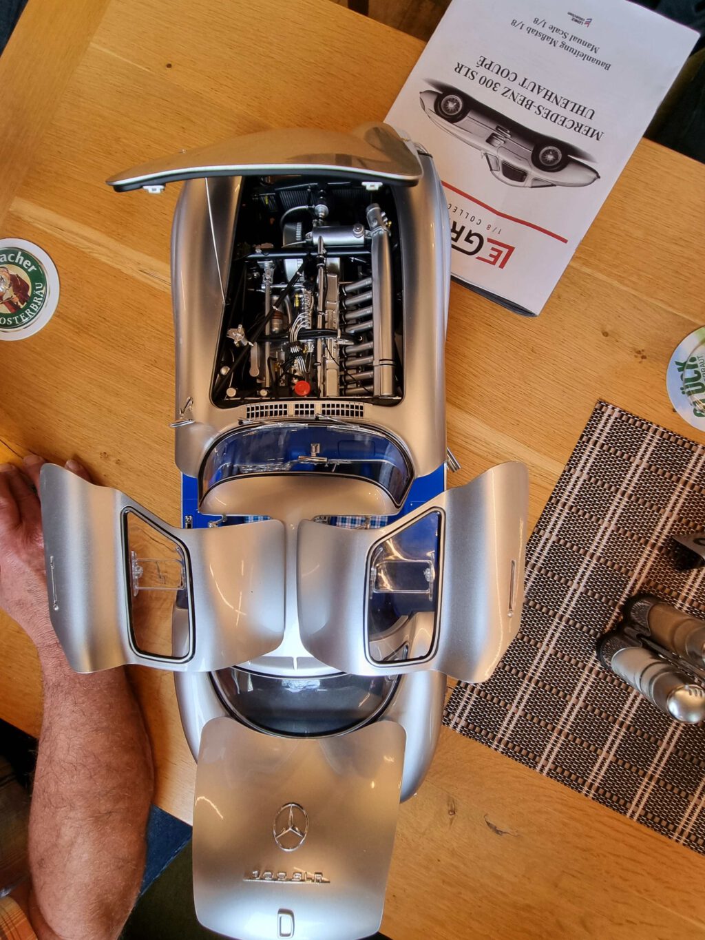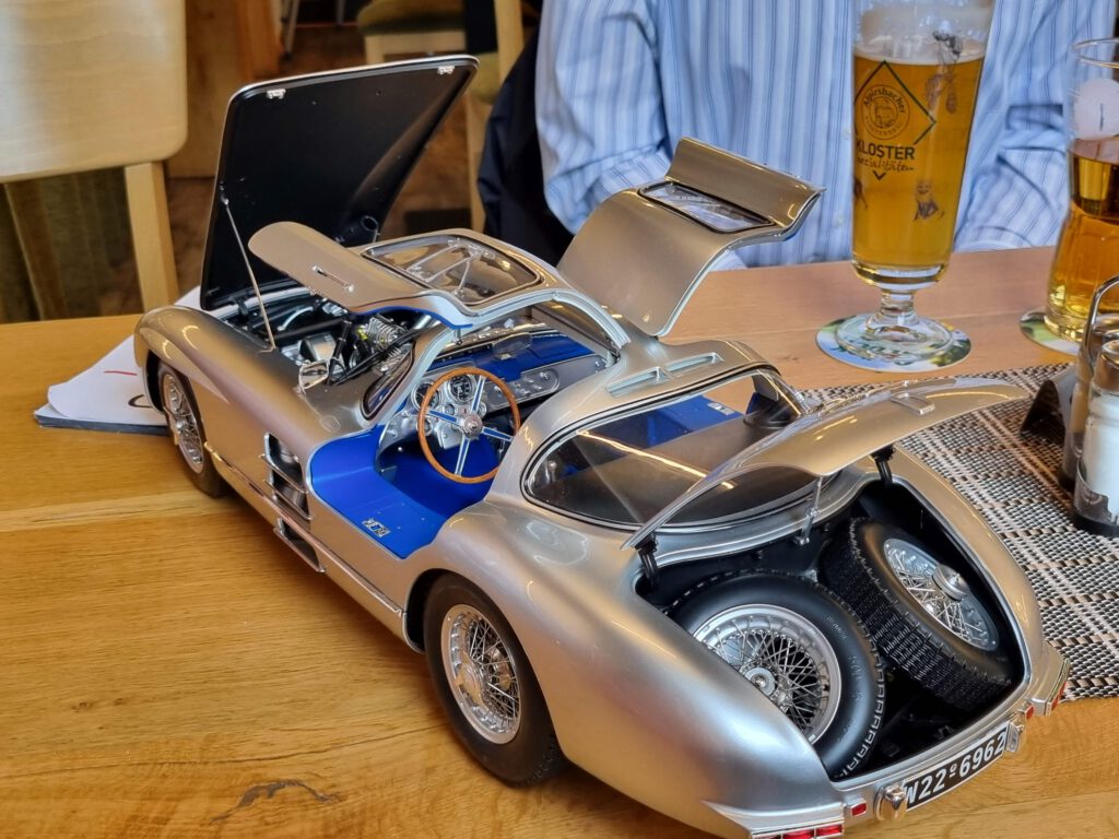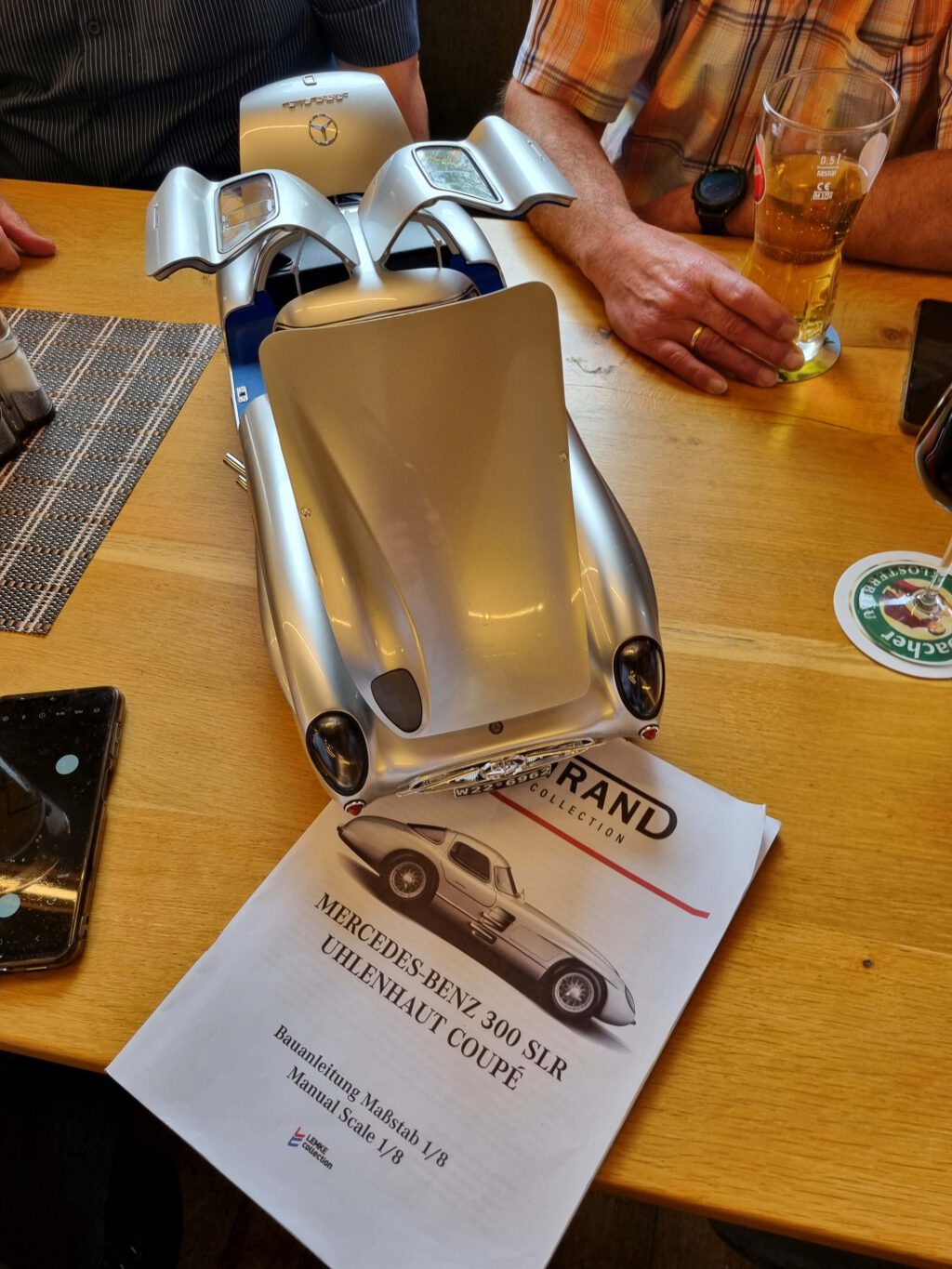 Trotzdem war das Highlight des Stammtischs ein ganz besonderer Gast, das Mercedes-Benz 300 SLR „Uhlenhaut-Coupé“ aus dem Metallbausatz LEGRAND von Firma Lemke im Maßstab 1/8. Unser lieber Club-Kamerad Dietmar Schiefer hat den Bausatz montiert und uns sein fertiges Uhlenhaut-Coupé als absolutes Highlight zum Stammtisch mitgebracht.