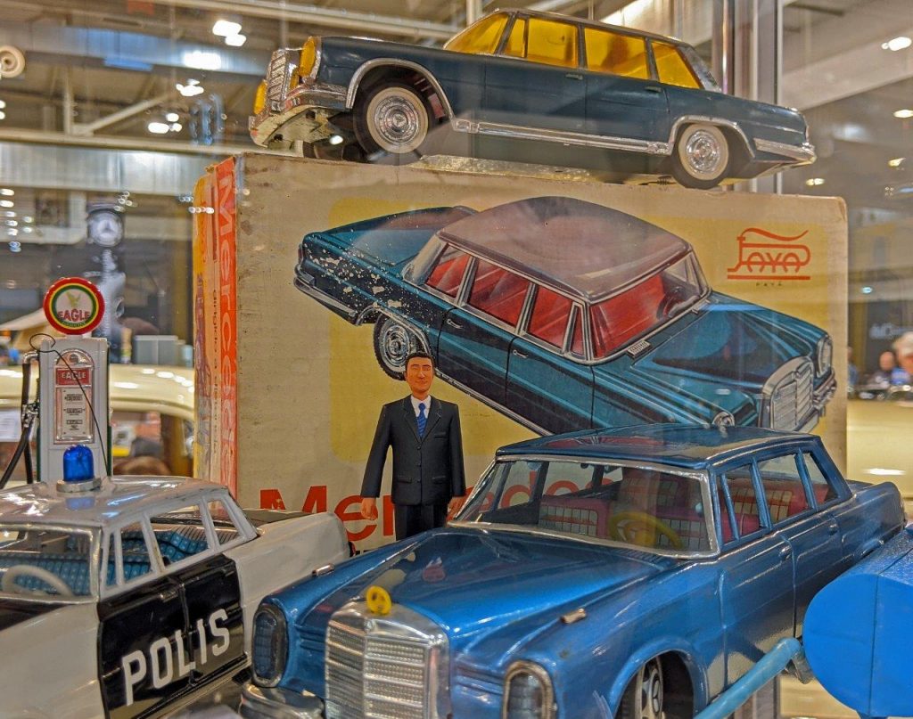 Unsere Modellausstellung wurde in 2 Vitrinen über je 5 Ebenen präsentiert: passend zur Carrerabahn hatte wir auf zwei Ebenen überwiegend ältere Rennbahnfahrzeuge verschiedener Hersteller in verschiedenen Maßstäben gezeigt, und natürlich wurden auch die diesjährigen Jubiläen zu 60 Jahre Pagode, 60 Jahre MB 600 und 70 Jahre Ponton mit alten, damals noch als Spielzeug gedachten Modelle gewürdigt. Die aufgefangenen Kommentare der interessierten Betrachter lassen sich leicht zusammenfassen: „den hab’ ich, den hab‘ ich auch, aber den kenne ich gar nicht!“. Leider haben wir keinen dieser Stimmeninhaber zu Mitarbeit und Mitgliedschaft im MBMC bewegen können.