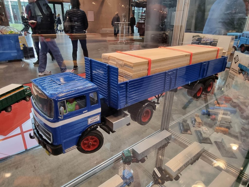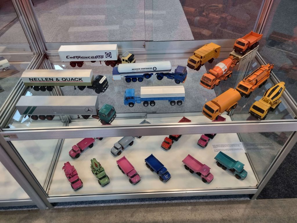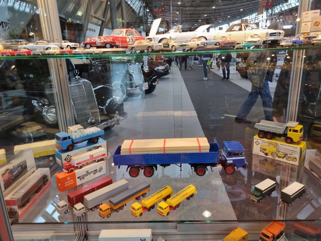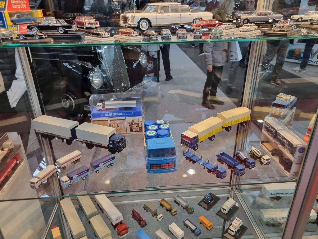 Die Dekoration der verschiedenen Ebenen lief so routiniert ab, dass wir zur Messeeröffnung stressfrei fertig waren. Bei der Auswahl der Modelle orientieren wir uns traditionell an Baureihen-Jubiläen der Vorbilder, sodass der MB 600 (W100), der Ponton sowie die Pagode im Mittelpunkt standen, ergänzt durch die Lkw mit kubischem Fahrerhaus.