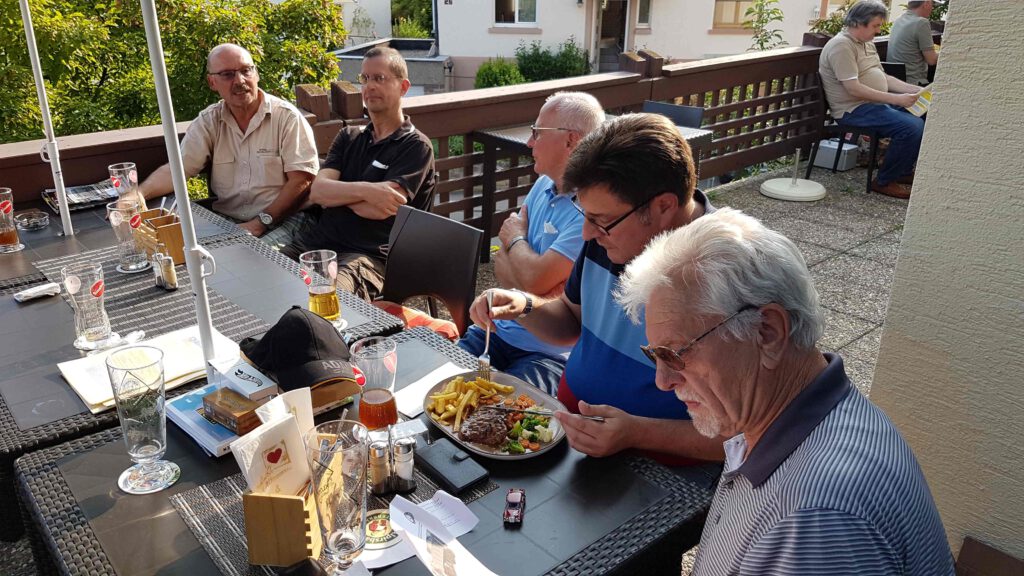 Unseren Juli-Stammtisch haben wir wieder in bewährter Weise in der Gaststätte Luginsland in der Fellbacher Straße im gleichnamigen Ortsteil von Stuttgart abgehalten. Die warmen Temperaturen bei blauem Himmel haben unser Treffen im herrlichen Freibereich auf der sonnendurchfluteten Terrasse ermöglicht. Groß war die Wiedersehensfreude und schon kurz vor 17:00 Uhr sah man die ersten Mitglieder am Auto stehend vor dem Eingangsbereich und im angeregten Fachgespräch vertieft.
