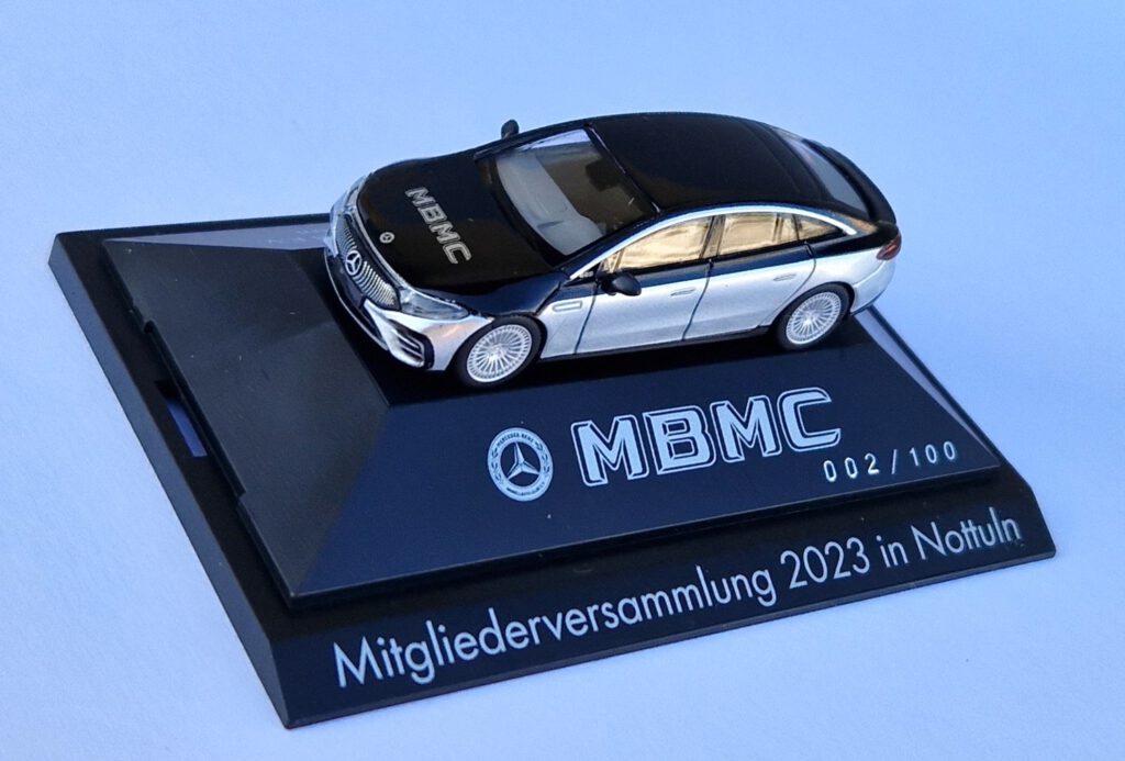 Ein echtes Highlight können die MBMC-Mitglieder zum Jahrestreffen 2023 in Nottuln erwerben. Der MBMC hat das Modell des EQS in einer aufwändigen Zweifarben-Lackierung produzieren lassen. Es ist auf Grund des hohen Aufwands absehbar, dass dies im Maßstab 1:87 das einzige Modell bleiben wird. Die Bedruckung von Modell und Sockel sowie die Durchnummerierung führt die langjährige Tradition der Club-Modelle aus Dietenhofen fort.