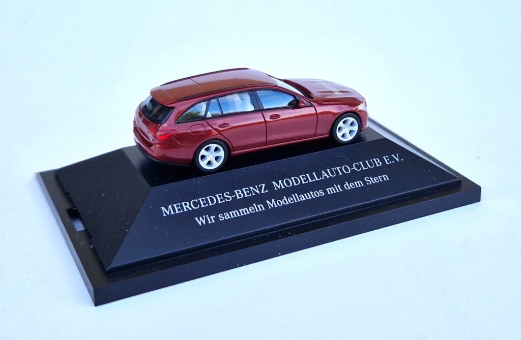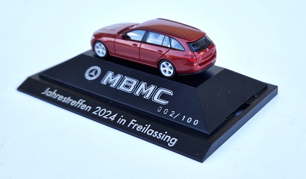 Das Sondermodell, welches anlässlich des MBMC-Jahrestreffens 2024 in Freilassing erworben werden konnte, ist ein T-Modell der aktuellen Baureihe S 206. Für die Karosserie haben wir die Lackierung patagonienrot bright metallic gewählt, das Interieur wurde in macciatobeige ausgeführt. Die Herpa-Artikelnummer lautet 958530. Die Bedruckungen auf der Motorhaube bzw. auf den Sockeln entsprechen den langjährigen Gepflogenheiten. Und auch die Durchnummerierung fehlt nicht.